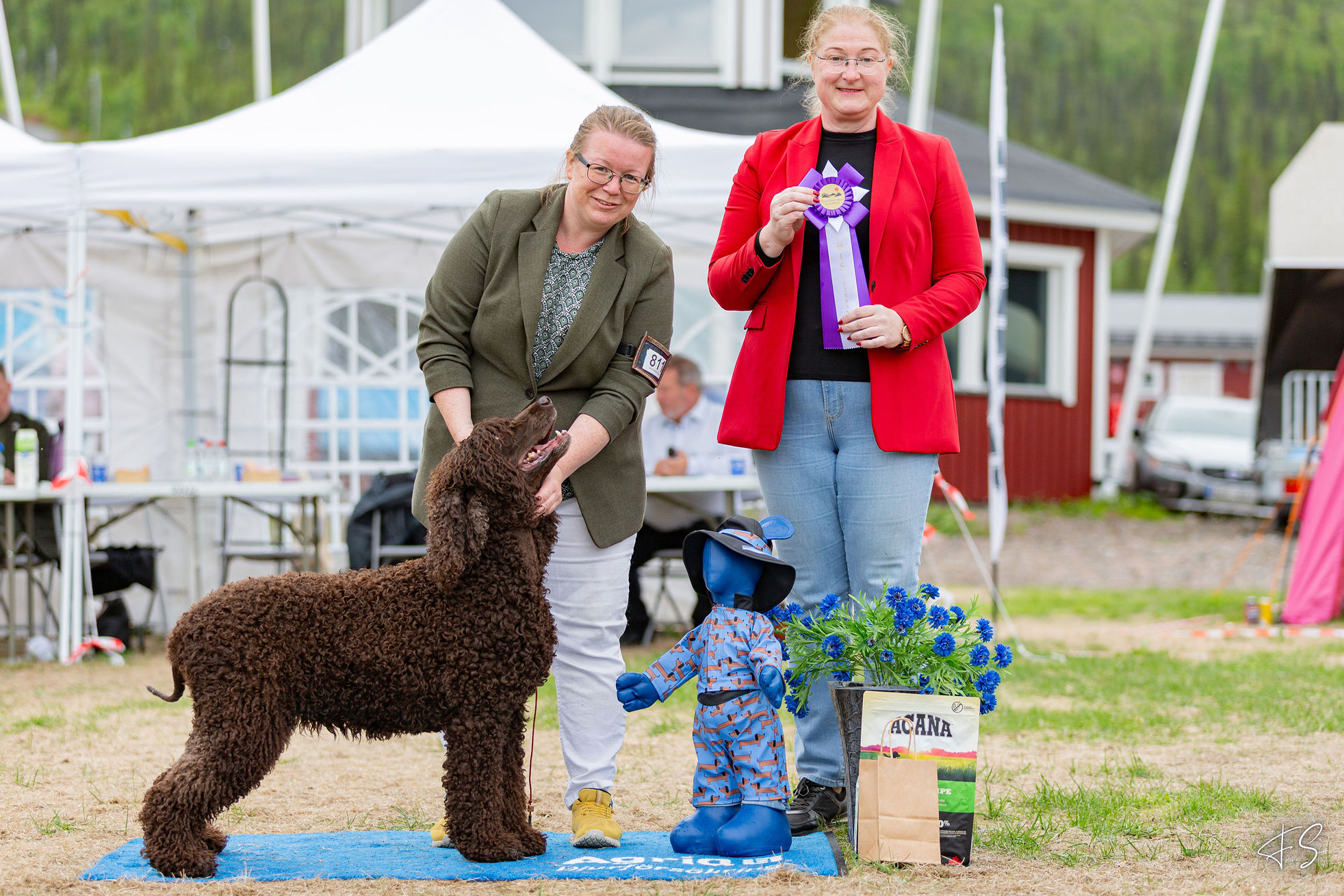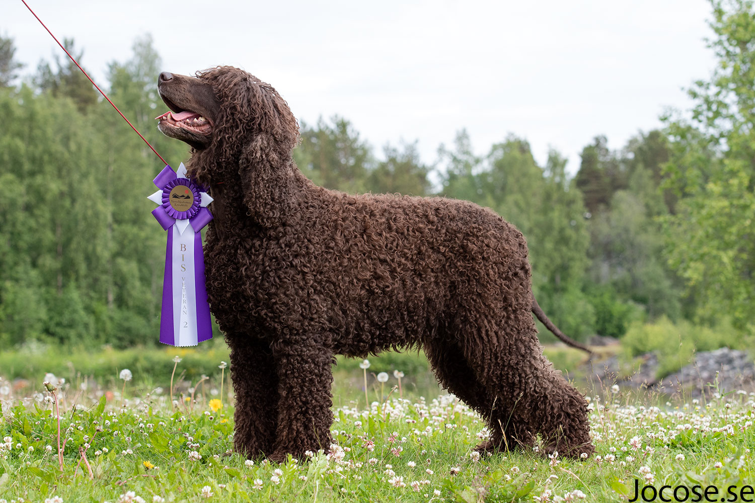 ”2,5 år, utmerket type størrelse og proporsjoner, god brede i skallen, kunne hatt litt mer stopp, tilstrekkelig kraft i snutepartiet, enda lyse øyne, utmerket hals, rett stram rygg, normalt vinklet frem og bak, enda litt knapt forbryst, og skal fortsatt bruke mye tid på å utvikle fult volum i brystkassen, god bredde over brystet, passe benstamme, store poter, trang bak, beveger seg med herlig kraft og driv sett fra siden, rikelig tette krøller på kropp og ben, herlig top knot, herlig humør og attitude, en meget tiltalende og typisk vann spaniel.”