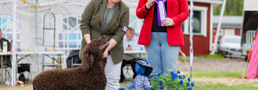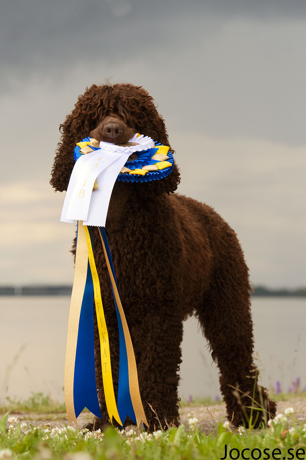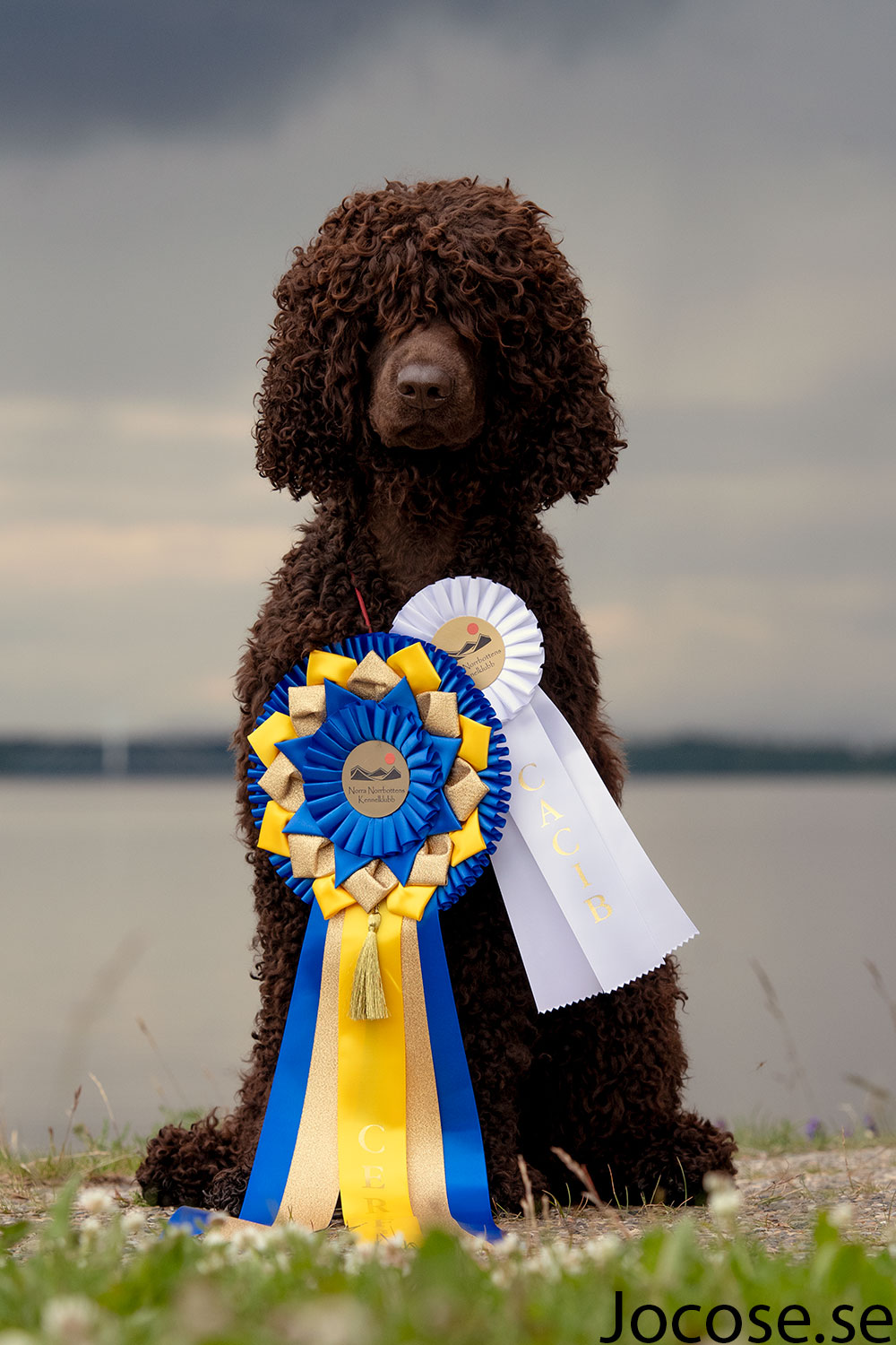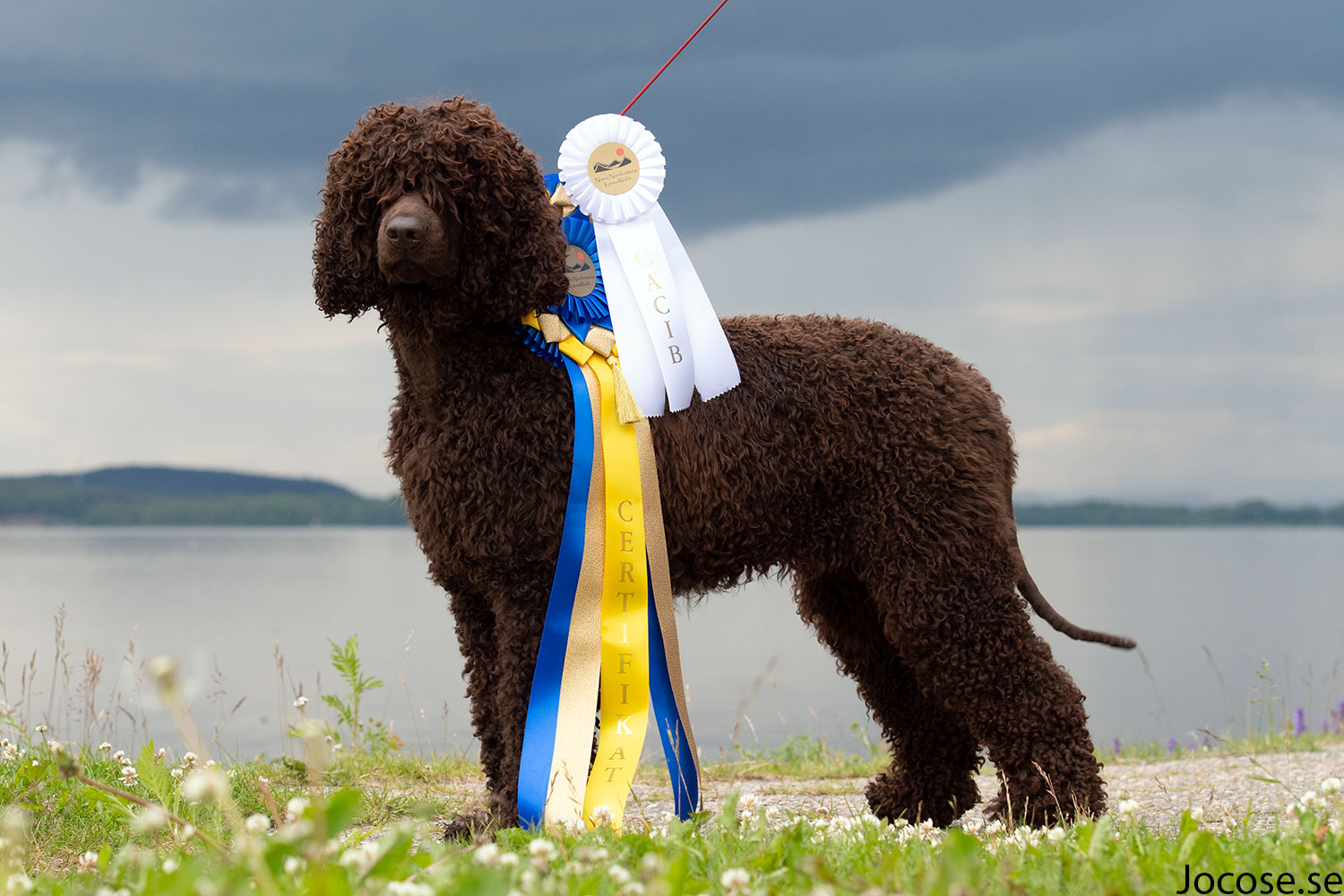 ”2,5 years old. Excellent type, well balanced with excellent expression of sex. Powerful head with good width. Could wish for a little more defined stop. Good strength in muzzle. Dark eyes with an intelligent expression. Long, well placed ears. Excellent neck and topline. Low placed tail. Lovely, well defined forchest. Ribs with good depth, could wish for a little more barrel shape. Well angulated behind with low hooks. Nice bone structure and big paws. Tight, nice curls. Excellent color. Moves with classic, rolling motions. Well presented”